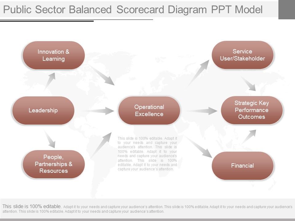 This is a public sector balanced scorecard diagram ppt model. This is a seven stage process. The stages in this process are service user stakeholder, strategic key performance outcomes, financial, people, partnerships and resources, leadership, innovation and learning, operational excellence.