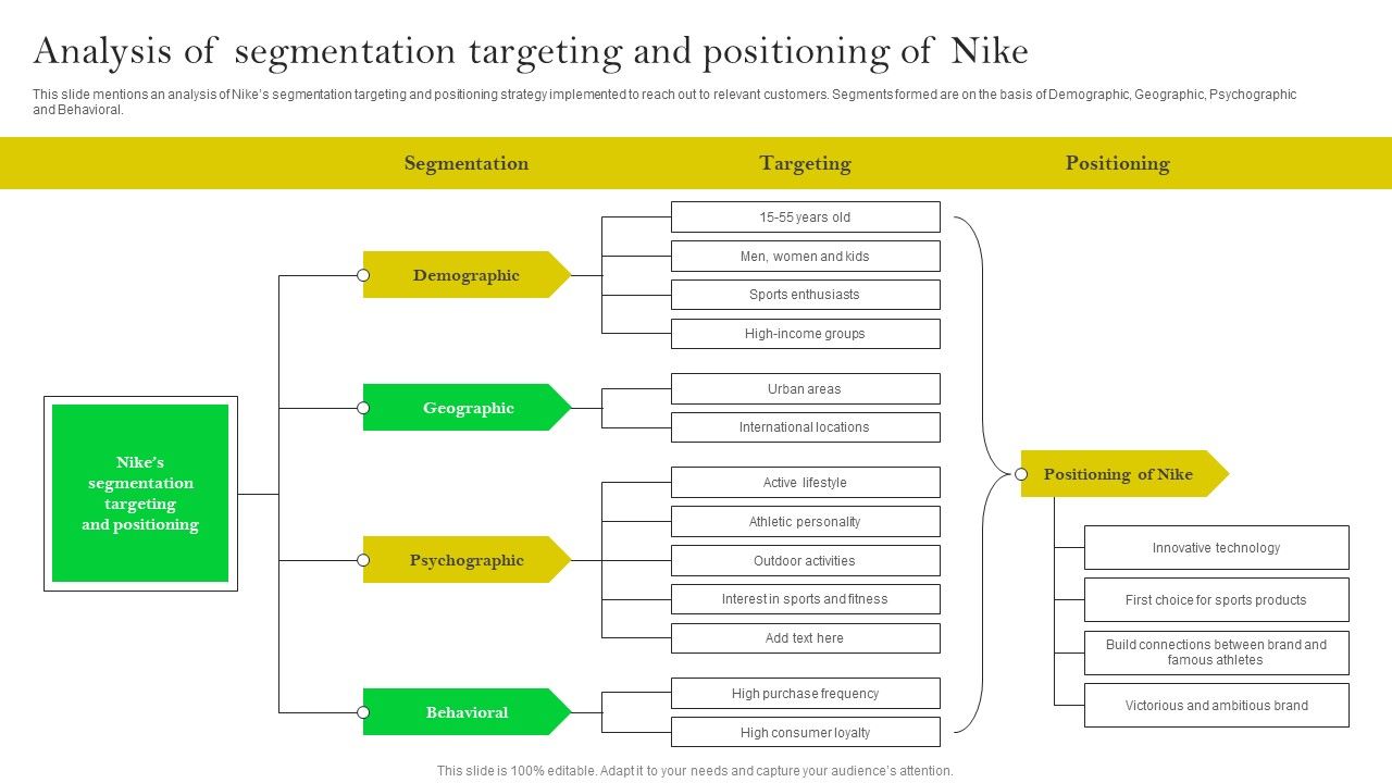 This slide mentions an analysis of Nikes segmentation targeting and positioning strategy implemented to reach out to relevant customers. Segments formed are on the basis of Demographic, Geographic, Psychographic and Behavioral. Create an editable Analysis Of Segmentation Targeting And Positioning Of Nike Topics PDF that communicates your idea and engages your audience. Whether you are presenting a business or an educational presentation, pre designed presentation templates help save time. Analysis Of Segmentation Targeting And Positioning Of Nike Topics PDF is highly customizable and very easy to edit, covering many different styles from creative to business presentations. Slidegeeks has creative team members who have crafted amazing templates. So, go and get them without any delay.