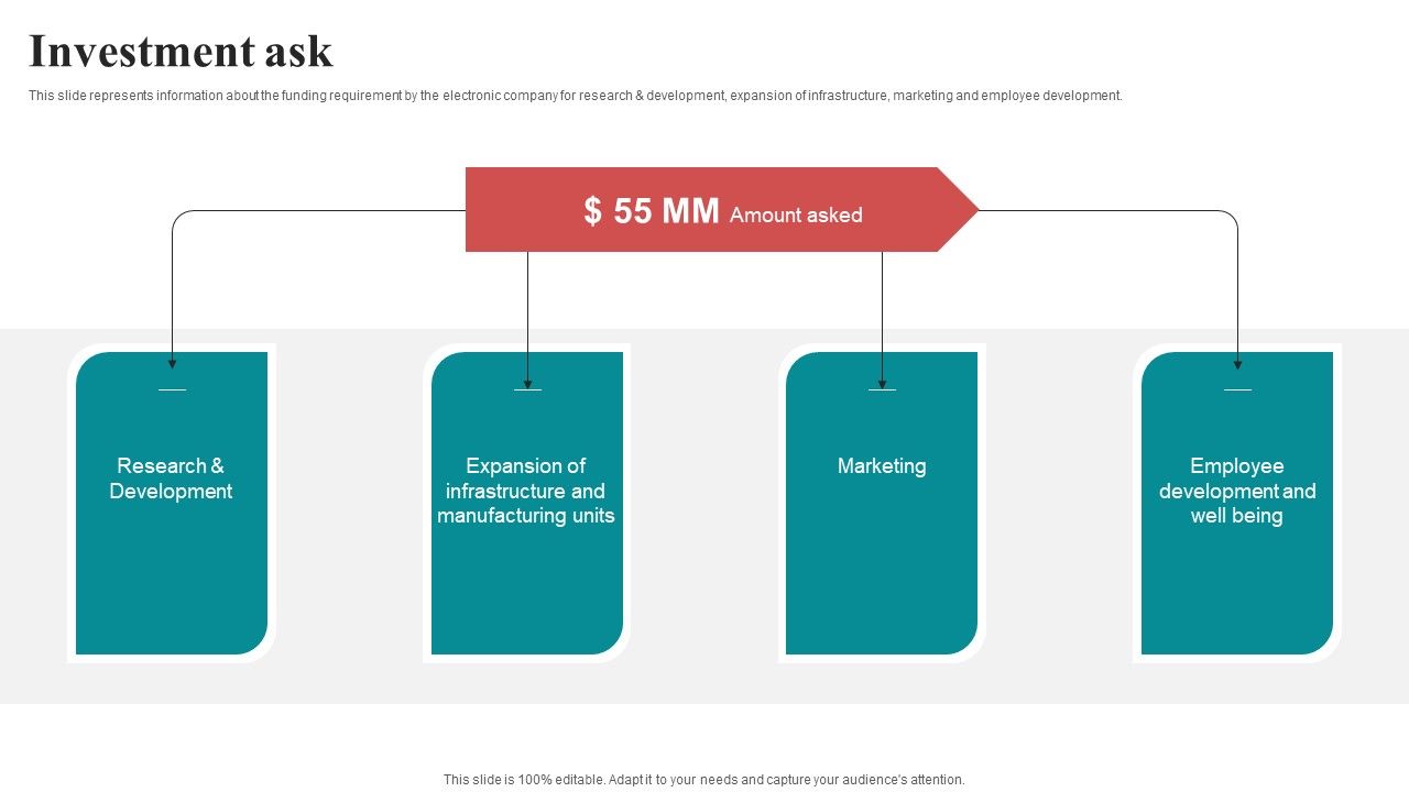 This slide represents information about the funding requirement by the electronic company for research and development, expansion of infrastructure, marketing and employee development. This modern and well-arranged Investment Ask Mobile Electronics Fund Raising Pitch Deck Professional PDF provides lots of creative possibilities. It is very simple to customize and edit with the Powerpoint Software. Just drag and drop your pictures into the shapes. All facets of this template can be edited with Powerpoint, no extra software is necessary. Add your own material, put your images in the places assigned for them, adjust the colors, and then you can show your slides to the world, with an animated slide included.