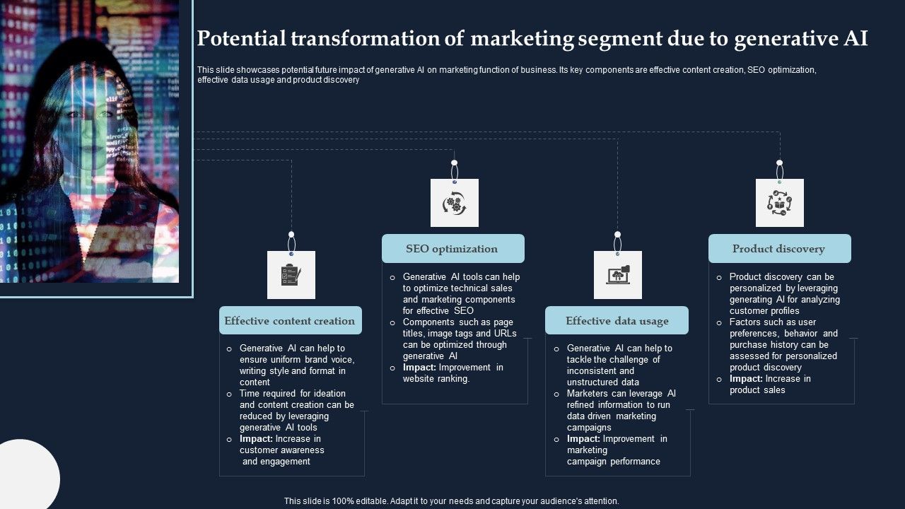 This slide showcases potential future impact of generative AI on marketing function of business. Its key components are effective content creation, SEO optimization, effective data usage and product discovery. Slidegeeks is one of the best resources for PowerPoint templates. You can download easily and regulate Potential Transformation Of Marketing Segment Due To Generative AI Graphics PDF for your personal presentations from our wonderful collection. A few clicks is all it takes to discover and get the most relevant and appropriate templates. Use our Templates to add a unique zing and appeal to your presentation and meetings. All the slides are easy to edit and you can use them even for advertisement purposes.