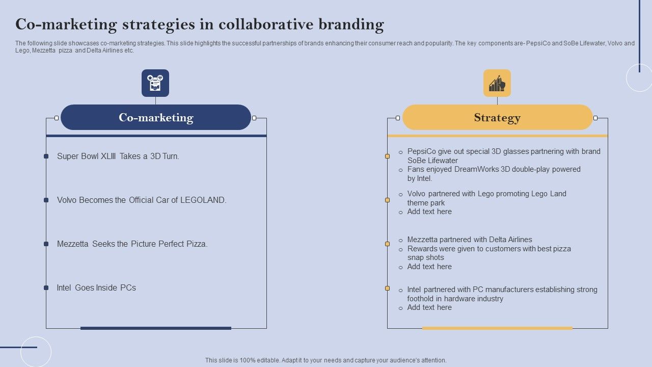 The following slide showcases co-marketing strategies. This slide highlights the successful partnerships of brands enhancing their consumer reach and popularity. The key components are- PepsiCo and SoBe Lifewater, Volvo and Lego, Mezzetta pizza and Delta Airlines etc. Persuade your audience using this Co Marketing Strategies In Collaborative Branding Designs PDF. This PPT design covers two stages, thus making it a great tool to use. It also caters to a variety of topics including Co Marketing, Strategy, Branding. Download this PPT design now to present a convincing pitch that not only emphasizes the topic but also showcases your presentation skills.