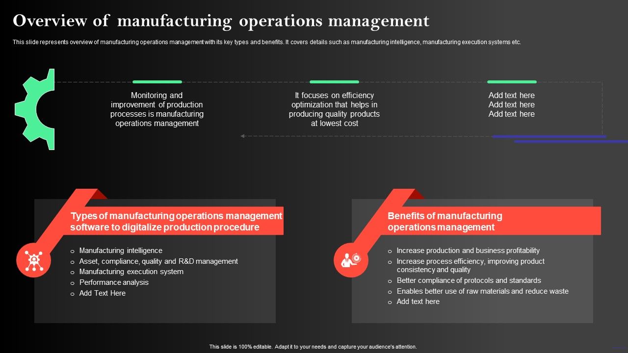 This slide represents overview of manufacturing operations management with its key types and benefits. It covers details such as manufacturing intelligence, manufacturing execution systems etc. If your project calls for a presentation, then Slidegeeks is your go to partner because we have professionally designed, easy to edit templates that are perfect for any presentation. After downloading, you can easily edit Manufacturing Operations Management Process Overview Of Manufacturing Operations Management Microsoft PDF and make the changes accordingly. You can rearrange slides or fill them with different images. Check out all the handy templates.