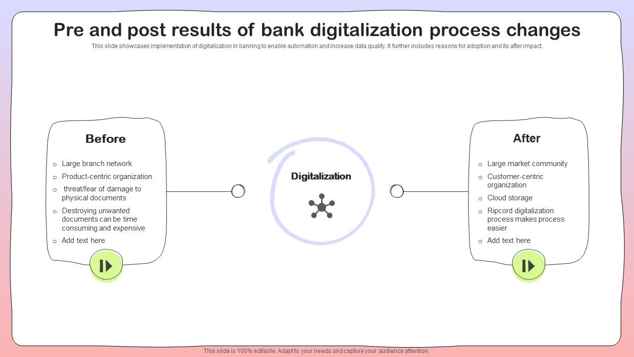 This slide showcases implementation of digitalization in banking to enable automation and increase data quality. It further includes reasons for adoption and its after impact. Presenting Pre And Post Results Of Bank Digitalization Process Changes Template PDF to dispense important information. This template comprises twop stages. It also presents valuable insights into the topics including Before, Digitalization , Customer Centric. This is a completely customizable PowerPoint theme that can be put to use immediately. So, download it and address the topic impactfully.