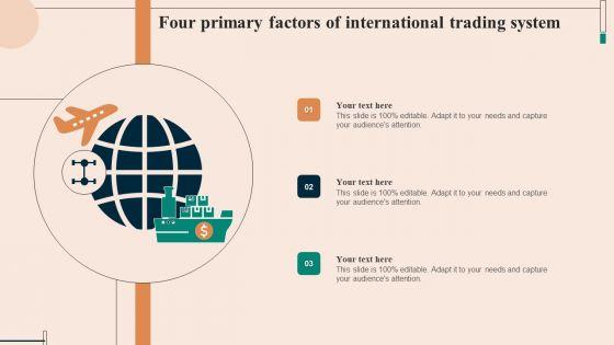 Persuade your audience using this Four Primary Factors Of International Trading System Icons PDF. This PPT design covers three stages, thus making it a great tool to use. It also caters to a variety of topics including Four Primary Factors, International, Trading System. Download this PPT design now to present a convincing pitch that not only emphasizes the topic but also showcases your presentation skills.