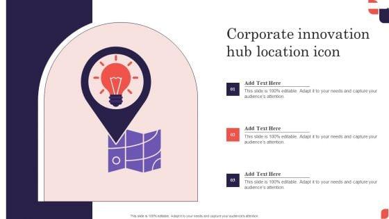 Presenting Corporate Innovation Hub Location Icon Graphics PDF to dispense important information. This template comprises three stages. It also presents valuable insights into the topics including Corporate, Innovation, Hub Location. This is a completely customizable PowerPoint theme that can be put to use immediately. So, download it and address the topic impactfully.
