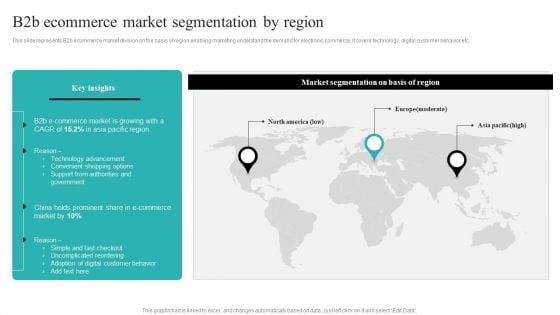 This slide represents b2b ecommerce market division on the basis of region enabling marketing understand the demand for electronic commerce. It covers technology, digital customer behavior etc. Create an editable Business To Business Digital Channel Management B2B Ecommerce Market Segmentation By Region Brochure PDF that communicates your idea and engages your audience. Whether you are presenting a business or an educational presentation, pre designed presentation templates help save time. Business To Business Digital Channel Management B2B Ecommerce Market Segmentation By Region Brochure PDF is highly customizable and very easy to edit, covering many different styles from creative to business presentations. Slidegeeks has creative team members who have crafted amazing templates. So, go and get them without any delay.