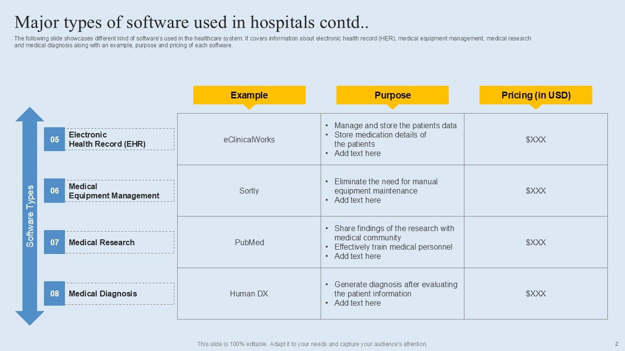 The following slide showcases various software used in day-to-day operations. E-prescribing, appointment scheduling, medical billing and hospital management are some of the major softwares which are mentioned in the slide. Presenting this PowerPoint presentation, titled Major Types Of Software Used In Hospitals Professional PDF, with topics curated by our researchers after extensive research. This editable presentation is available for immediate download and provides attractive features when used. Download now and captivate your audience. Presenting this Major Types Of Software Used In Hospitals Professional PDF. Our researchers have carefully researched and created these slides with all aspects taken into consideration. This is a completely customizable Major Types Of Software Used In Hospitals Professional PDF that is available for immediate downloading. Download now and make an impact on your audience. Highlight the attractive features available with our PPTs.