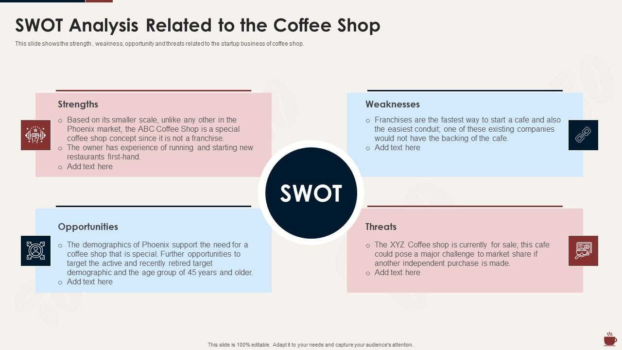 This slide shows the strength , weakness, opportunity and threats related to the startup business of coffee shop. This is a master plan for opening bistro swot analysis related to the coffee shop introduction pdf template with various stages. Focus and dispense information on four stages using this creative set, that comes with editable features. It contains large content boxes to add your information on topics like strengths, opportunities, weaknesses, threats. You can also showcase facts, figures, and other relevant content using this PPT layout. Grab it now.