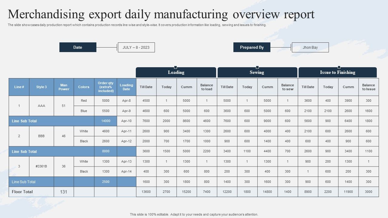 The slide showcases daily production report which contains production records line wise and style-wise. It covers production information like loading, sewing and issues to finishing. Showcasing this set of slides titled Merchandising Export Daily Manufacturing Overview Report Graphics PDF. The topics addressed in these templates are Report, Merchandising, Manufacturing. All the content presented in this PPT design is completely editable. Download it and make adjustments in color, background, font etc. as per your unique business setting.