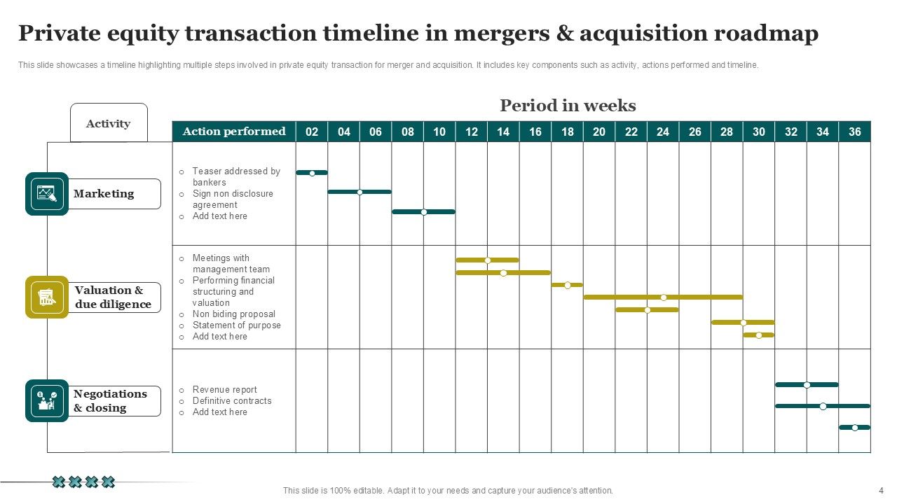 If designing a presentation takes a lot of your time and resources and you are looking for a better alternative, then this Mergers And Acquisition Roadmap Ppt PowerPoint Presentation Complete Deck With Slides is the right fit for you. This is a prefabricated set that can help you deliver a great presentation on the topic. All the twelve slides included in this sample template can be used to present a birds-eye view of the topic. These slides are also fully editable, giving you enough freedom to add specific details to make this layout more suited to your business setting. Apart from the content, all other elements like color, design, theme are also replaceable and editable. This helps in designing a variety of presentations with a single layout. Not only this, you can use this PPT design in formats like PDF, PNG, and JPG once downloaded. Therefore, without any further ado, download and utilize this sample presentation as per your liking.