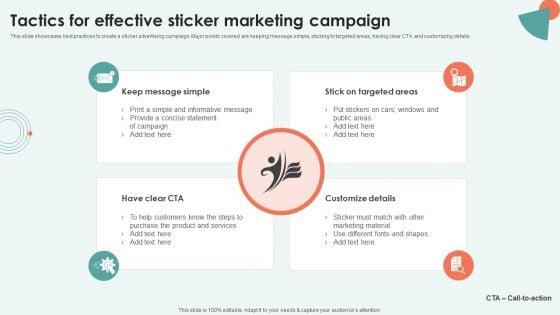 This slide showcases best practices to create a sticker advertising campaign. Major points covered are keeping message simple, sticking to targeted areas, having clear CTA and customizing details. This Tactics For Effective Sticker Marketing Campaign Ppt Show Brochure PDF is perfect for any presentation, be it in front of clients or colleagues. It is a versatile and stylish solution for organizing your meetings. The product features a modern design for your presentation meetings. The adjustable and customizable slides provide unlimited possibilities for acing up your presentation. Slidegeeks has done all the homework before launching the product for you. So, do not wait, grab the presentation templates today