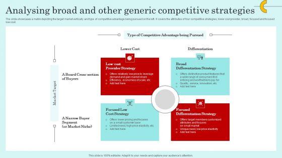 The slide showcases a matrix depicting the target market vertically and type of competitive advantage being pursued on the left. It covers the attributes of four competitive strategies lower cost provider, broad, focused and focused low cost. Presenting Analysing Broad And Other Generic Competitive Strategies Topics PDF to dispense important information. This template comprises four stages. It also presents valuable insights into the topics including Provider Strategy, Broad Differentiation Strategy, Focused Differentiation Strategy. This is a completely customizable PowerPoint theme that can be put to use immediately. So, download it and address the topic impactfully.