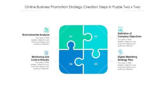 Presenting online business promotion strategy creation steps in puzzle two x two ppt outline icons pdf. to dispense important information. This template comprises four stages. It also presents valuable insights into the topics including environmental analysis, monitoring and control results, digital marketing strategy plan. This is a completely customizable PowerPoint theme that can be put to use immediately. So, download it and address the topic impactfully.