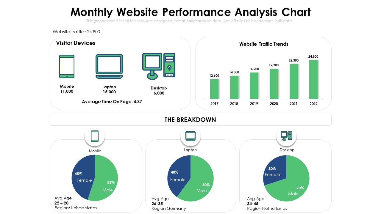Pitch your topic with ease and precision using this monthly website performance analysis chart ppt powerpoint presentation model skills pdf. This layout presents information on visitor devices, maverage time, the breakdown, laptop, desktop, mobile. It is also available for immediate download and adjustment. So, changes can be made in the color, design, graphics or any other component to create a unique layout.