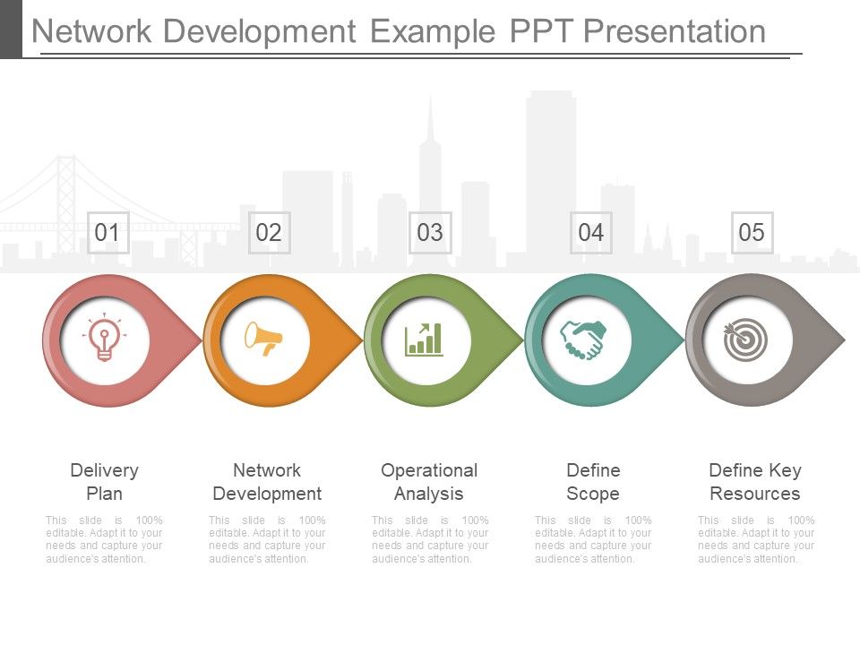 This is a network development example ppt presentation. This is a five stage process. The stages in this process are delivery plan, network development, operational analysis, define scope, define key resources.