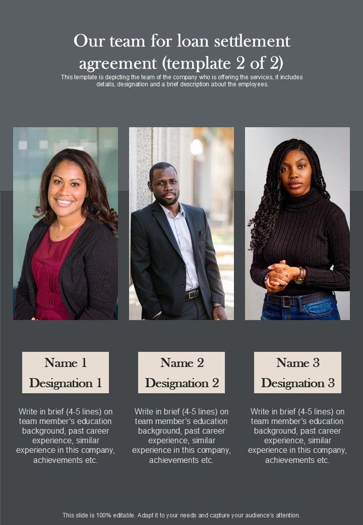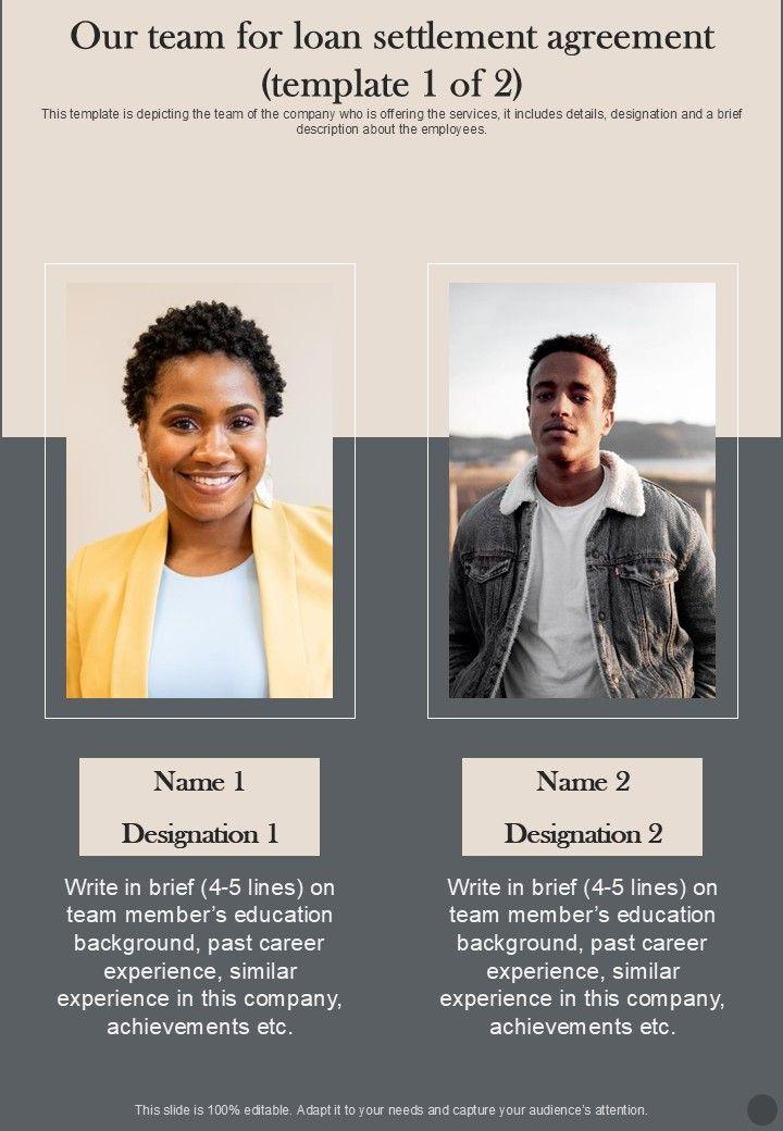 Presenting you an exemplary Our Team For Loan Settlement Agreement One Pager Sample Example Document. Our one-pager comprises all the must-have essentials of an inclusive document. You can edit it with ease, as its layout is completely editable. With such freedom, you can tweak its design and other elements to your requirements. Download this Our Team For Loan Settlement Agreement One Pager Sample Example Document brilliant piece now.