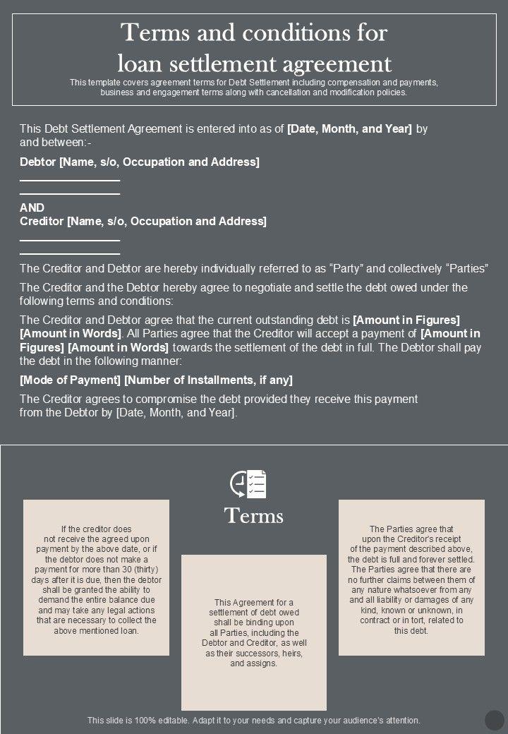 Presenting you an exemplary Terms And Conditions For Loan Settlement Agreement One Pager Sample Example Document. Our one-pager comprises all the must-have essentials of an inclusive document. You can edit it with ease, as its layout is completely editable. With such freedom, you can tweak its design and other elements to your requirements. Download this Terms And Conditions For Loan Settlement Agreement One Pager Sample Example Document brilliant piece now.