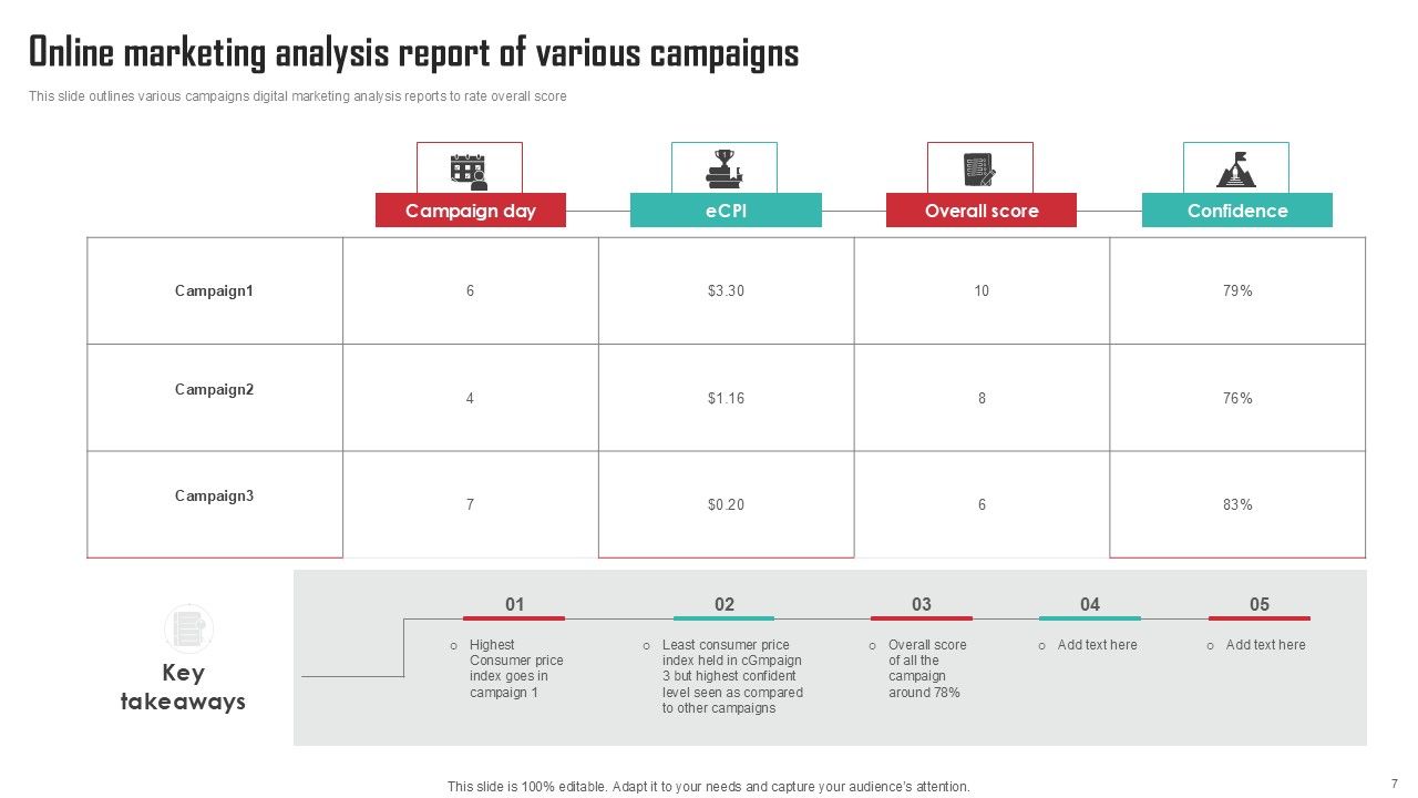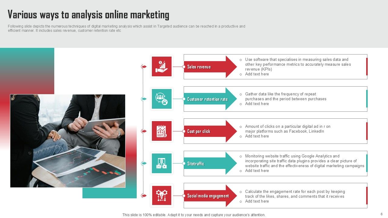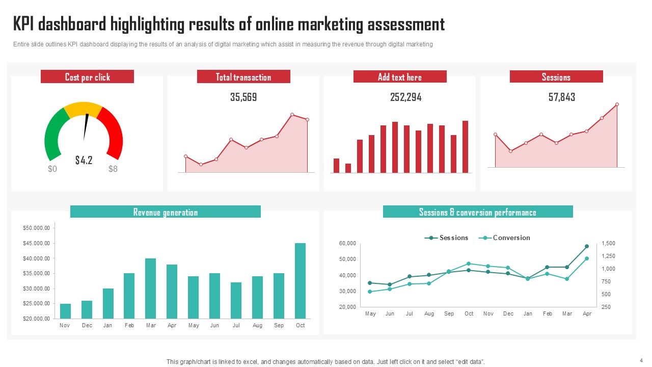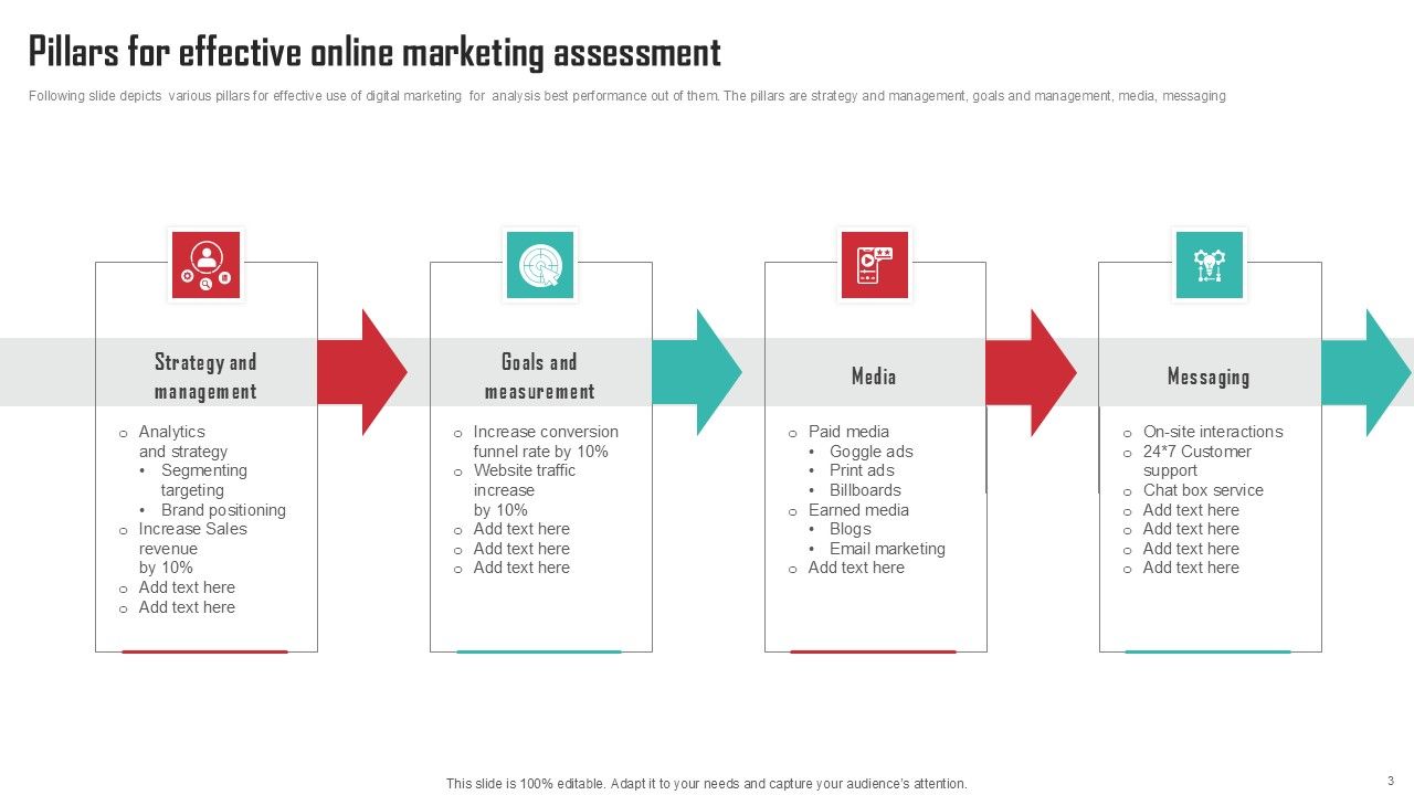 Improve your presentation delivery using this Online Marketing Assessment Ppt PowerPoint Presentation Complete Deck With Slides. Support your business vision and objectives using this well-structured PPT deck. This template offers a great starting point for delivering beautifully designed presentations on the topic of your choice. Comprising twelve this professionally designed template is all you need to host discussion and meetings with collaborators. Each slide is self-explanatory and equipped with high-quality graphics that can be adjusted to your needs. Therefore, you will face no difficulty in portraying your desired content using this PPT slideshow. This PowerPoint slideshow contains every important element that you need for a great pitch. It is not only editable but also available for immediate download and utilization. The color, font size, background, shapes everything can be modified to create your unique presentation layout. Therefore, download it now.