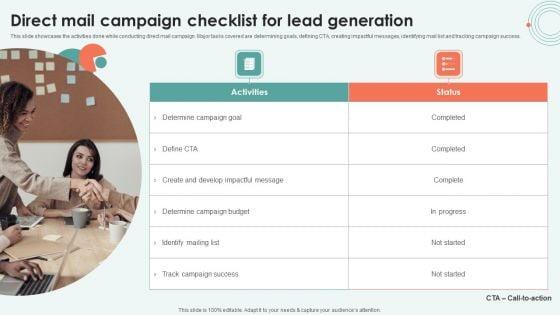 This slide showcases the activities done while conducting direct mail campaign. Major tasks covered are determining goals, defining CTA, creating impactful messages, identifying mail list and tracking campaign success. Want to ace your presentation in front of a live audience Our Direct Mail Campaign Checklist For Lead Generation Ppt Professional Mockup PDF can help you do that by engaging all the users towards you. Slidegeeks experts have put their efforts and expertise into creating these impeccable powerpoint presentations so that you can communicate your ideas clearly. Moreover, all the templates are customizable, and easy to edit and downloadable. Use these for both personal and commercial use.
