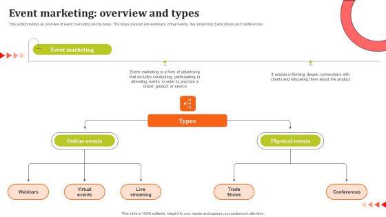 This slide provides an overview of event marketing and its types. The types covered are webinars, virtual events, live streaming, trade shows and conferences. Explore a selection of the finest Event Marketing Overview And Types Ppt Topics PDF here. With a plethora of professionally designed and pre made slide templates, you can quickly and easily find the right one for your upcoming presentation. You can use our Event Marketing Overview And Types Ppt Topics PDF to effectively convey your message to a wider audience. Slidegeeks has done a lot of research before preparing these presentation templates. The content can be personalized and the slides are highly editable. Grab templates today from Slidegeeks.