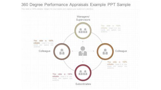 This is a 360 degree performance appraisals example ppt sample. This is a four stage process. The stages in this process are managers supervisors, colleague, subordinates.