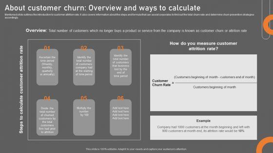 Mentioned slide outlines the introduction to customer attrition rate. It also covers information about the steps and formula that can assist corporates to find out the total churn rate and determine churn prevention strategies accordingly. If you are looking for a format to display your unique thoughts, then the professionally designed About Customer Churn Overview And Ways To Calculate Download PDF is the one for you. You can use it as a Google Slides template or a PowerPoint template. Incorporate impressive visuals, symbols, images, and other charts. Modify or reorganize the text boxes as you desire. Experiment with shade schemes and font pairings. Alter, share or cooperate with other people on your work. Download About Customer Churn Overview And Ways To Calculate Download PDF and find out how to give a successful presentation. Present a perfect display to your team and make your presentation unforgettable.