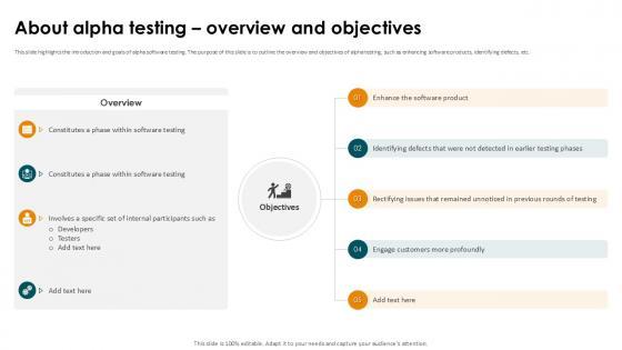 This slide highlights the introduction and goals of alpha software testing. The purpose of this slide is to outline the overview and objectives of alpha testing, such as enhancing software products, identifying defects, etc. Create an editable About Alpha Testing Overview And Objectives Smoke Testing Ppt Example that communicates your idea and engages your audience. Whether you are presenting a business or an educational presentation, pre-designed presentation templates help save time. About Alpha Testing Overview And Objectives Smoke Testing Ppt Example is highly customizable and very easy to edit, covering many different styles from creative to business presentations. Slidegeeks has creative team members who have crafted amazing templates. So, go and get them without any delay. This slide highlights the introduction and goals of alpha software testing. The purpose of this slide is to outline the overview and objectives of alpha testing, such as enhancing software products, identifying defects, etc.