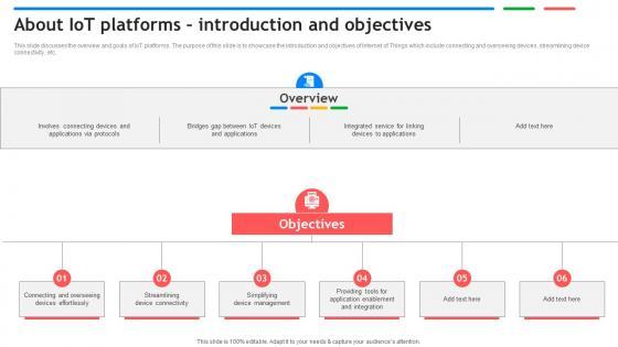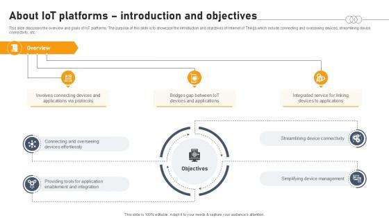This slide discusses the overview and goals of IoT platforms. The purpose of this slide is to showcase the introduction and objectives of Internet of Things which include connecting and overseeing devices, streamlining device connectivity, etc. Coming up with a presentation necessitates that the majority of the effort goes into the content and the message you intend to convey. The visuals of a PowerPoint presentation can only be effective if it supplements and supports the story that is being told. Keeping this in mind our experts created About Iot Platforms Introduction And Objectives Aws IOT Platform Ppt Template to reduce the time that goes into designing the presentation. This way, you can concentrate on the message while our designers take care of providing you with the right template for the situation. This slide discusses the overview and goals of IoT platforms. The purpose of this slide is to showcase the introduction and objectives of Internet of Things which include connecting and overseeing devices, streamlining device connectivity, etc.