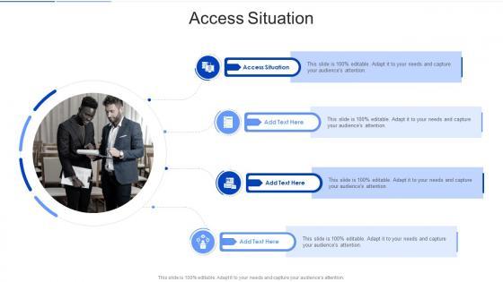 Introducing our well-designed Access Situation In Powerpoint And Google Slides Cpb. This PowerPoint design presents information on topics like Access Situation. As it is predesigned it helps boost your confidence level. It also makes you a better presenter because of its high-quality content and graphics. This PPT layout can be downloaded and used in different formats like PDF, PNG, and JPG. Not only this, it is available in both Standard Screen and Widescreen aspect ratios for your convenience. Therefore, click on the download button now to persuade and impress your audience. Our Access Situation In Powerpoint And Google Slides Cpb are topically designed to provide an attractive backdrop to any subject. Use them to look like a presentation pro.