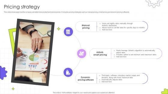 This slide showcases how the company will determine product and service prices. It includes pricing strategies such as manual pricing, smart pricing and dynamic pricing softwares. Boost your pitch with our creative Pricing Strategy Guest Accommodation Service Business Model BMC SS V. Deliver an awe-inspiring pitch that will mesmerize everyone. Using these presentation templates you will surely catch everyones attention. You can browse the ppts collection on our website. We have researchers who are experts at creating the right content for the templates. So you do not have to invest time in any additional work. Just grab the template now and use them. This slide showcases how the company will determine product and service prices. It includes pricing strategies such as manual pricing, smart pricing and dynamic pricing softwares.