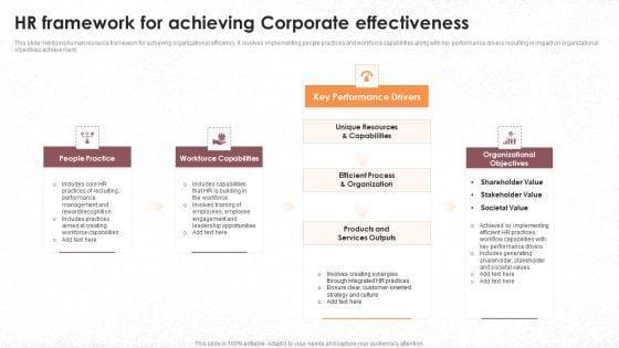 This slide mentions human resource framework for achieving organizational efficiency. It involves implementing people practices and workforce capabilities along with key performance drivers resulting in impact on organizational objectives achievement. Pitch your topic with ease and precision using this HR Framework For Achieving Corporate Effectiveness Infographics PDF. This layout presents information on People Practice, Workforce Capabilities, Key Performance Drivers, Organizational Objectives. It is also available for immediate download and adjustment. So, changes can be made in the color, design, graphics or any other component to create a unique layout.