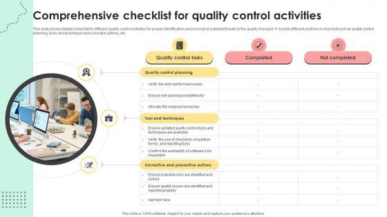 This slide shows detailed checklist for different quality control activities for proper identification and removal of potential threats to the quality of project. It include different sections in checklist such as quality control planning, tools and techniques and corrective actions, etc. Get a simple yet stunning designed Administering Quality Assurance Comprehensive Checklist For Quality Control Activities PM SS V. It is the best one to establish the tone in your meetings. It is an excellent way to make your presentations highly effective. So, download this PPT today from Slidegeeks and see the positive impacts. Our easy-to-edit Administering Quality Assurance Comprehensive Checklist For Quality Control Activities PM SS V can be your go-to option for all upcoming conferences and meetings. So, what are you waiting for Grab this template today. This slide shows detailed checklist for different quality control activities for proper identification and removal of potential threats to the quality of project. It include different sections in checklist such as quality control planning, tools and techniques and corrective actions, etc.