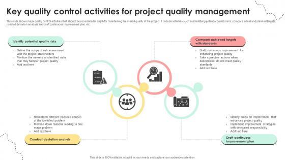 This slide shows major quality control activities that should be considered in depth for maintaining the overall quality of the project. It include activities such as identifying potential quality risks, compare actual and planned targets, conduct deviation analysis and draft continuous improvement plan, etc. Are you searching for a Administering Quality Assurance Key Quality Control Activities For Project Quality Management PM SS V that is uncluttered, straightforward, and original Its easy to edit, and you can change the colors to suit your personal or business branding. For a presentation that expresses how much effort you have put in, this template is ideal With all of its features, including tables, diagrams, statistics, and lists, its perfect for a business plan presentation. Make your ideas more appealing with these professional slides. Download Administering Quality Assurance Key Quality Control Activities For Project Quality Management PM SS V from Slidegeeks today. This slide shows major quality control activities that should be considered in depth for maintaining the overall quality of the project. It include activities such as identifying potential quality risks, compare actual and planned targets, conduct deviation analysis and draft continuous improvement plan, etc.
