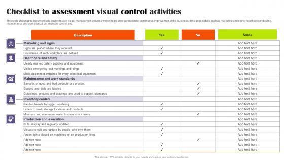 This slide showcases the checklist to audit effective visual management activities which helps an organization for continuous improvement of the business. It includes details such as marketing and signs, healthcare and safety, maintenance and work standards, inventory control, etc. Pitch your topic with ease and precision using this Checklist To Assessment Visual Control Activities Slides Pdf This layout presents information on Marketing And Signs, Healthcare And Safety, Production And Execution It is also available for immediate download and adjustment. So, changes can be made in the color, design, graphics or any other component to create a unique layout. This slide showcases the checklist to audit effective visual management activities which helps an organization for continuous improvement of the business. It includes details such as marketing and signs, healthcare and safety, maintenance and work standards, inventory control, etc.