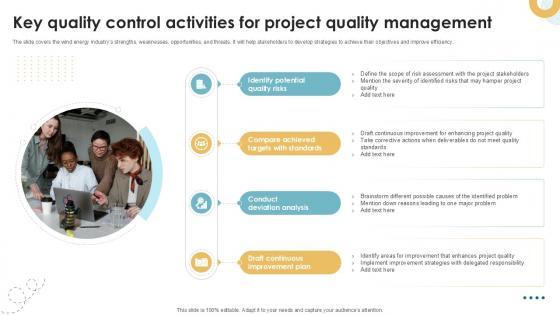 The slide covers the wind energy industrys strengths, weaknesses, opportunities, and threats. It will help stakeholders to develop strategies to achieve their objectives and improve efficiency. Presenting this PowerPoint presentation, titled Key Quality Control Activities For Project Executing Quality Ppt Example PM SS V, with topics curated by our researchers after extensive research. This editable presentation is available for immediate download and provides attractive features when used. Download now and captivate your audience. Presenting this Key Quality Control Activities For Project Executing Quality Ppt Example PM SS V. Our researchers have carefully researched and created these slides with all aspects taken into consideration. This is a completely customizable Key Quality Control Activities For Project Executing Quality Ppt Example PM SS V that is available for immediate downloading. Download now and make an impact on your audience. Highlight the attractive features available with our PPTs. The slide covers the wind energy industrys strengths, weaknesses, opportunities, and threats. It will help stakeholders to develop strategies to achieve their objectives and improve efficiency.