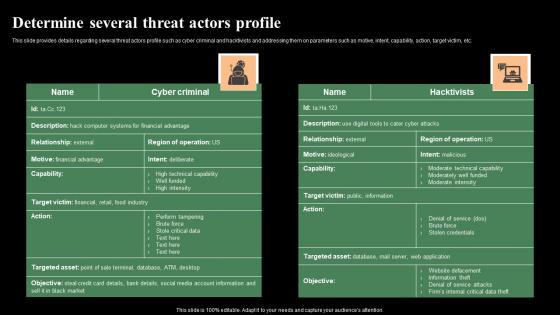 This slide provides details regarding several threat actors profile such as cyber criminal and hacktivists and addressing them on parameters such as motive, intent, capability, action, target victim, etc. Slidegeeks is one of the best resources for PowerPoint templates. You can download easily and regulate Determine Several Threat Actors Profile Monitoring Digital Assets Topics Pdf for your personal presentations from our wonderful collection. A few clicks is all it takes to discover and get the most relevant and appropriate templates. Use our Templates to add a unique zing and appeal to your presentation and meetings. All the slides are easy to edit and you can use them even for advertisement purposes. This slide provides details regarding several threat actors profile such as cyber criminal and hacktivists and addressing them on parameters such as motive, intent, capability, action, target victim, etc.