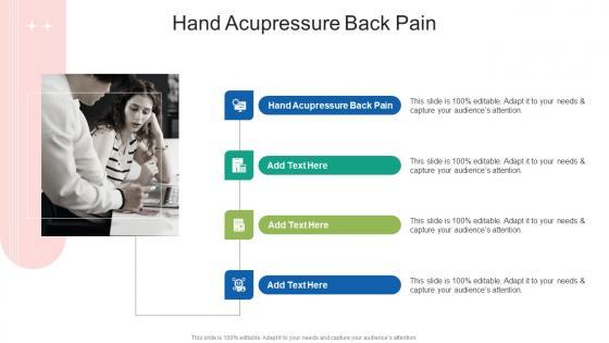 Introducing our well designed Hand Acupressure Back Pain In Powerpoint And Google Slides Cpb. This PowerPoint design presents information on topics like Hand Acupressure Back Pain. As it is predesigned it helps boost your confidence level. It also makes you a better presenter because of its high-quality content and graphics. This PPT layout can be downloaded and used in different formats like PDF, PNG, and JPG. Not only this, it is available in both Standard Screen and Widescreen aspect ratios for your convenience. Therefore, click on the download button now to persuade and impress your audience. Our Hand Acupressure Back Pain In Powerpoint And Google Slides Cpb are topically designed to provide an attractive backdrop to any subject. Use them to look like a presentation pro.