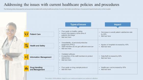 The following slide showcases the various problems related with existing healthcare policies. It covers information about the type of issues and impact of each policy on the hospital. Find a pre designed and impeccable Addressing The Issues With Current Healthcare Policies And Procedures Microsoft PDF. The templates can ace your presentation without additional effort. You can download these easy to edit presentation templates to make your presentation stand out from others. So, what are you waiting for Download the template from Slidegeeks today and give a unique touch to your presentation.