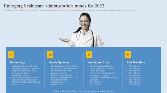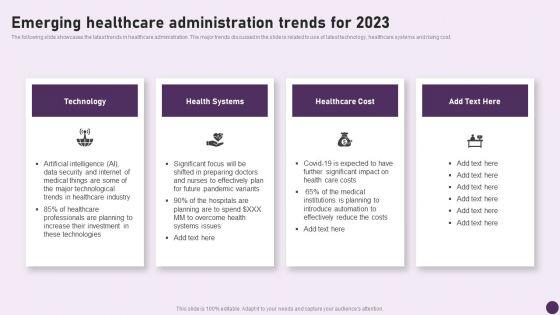The following slide showcases the latest trends in healthcare administration. The major trends discussed in the slide is related to use of latest technology, healthcare systems and rising cost. Formulating a presentation can take up a lot of effort and time, so the content and message should always be the primary focus. The visuals of the PowerPoint can enhance the presenters message, so our Emerging Healthcare Administration Trends For 2023 Sample PDF was created to help save time. Instead of worrying about the design, the presenter can concentrate on the message while our designers work on creating the ideal templates for whatever situation is needed. Slidegeeks has experts for everything from amazing designs to valuable content, we have put everything into Emerging Healthcare Administration Trends For 2023 Sample PDF