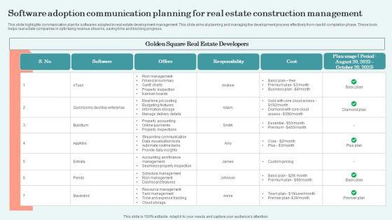 This slide highlights communication plan for softwares adopted in real estate development management. This slide aims at planning and managing the development process effectively from raw till completion phase. These tools helps real estate companies in optimizing revenue streams, saving time and tracking progress. Pitch your topic with ease and precision using this Software Adoption Communication Planning For Real Estate Construction Management Topics PDF. This layout presents information on Software Adoption Communication Planning, Real Estate Construction Management. It is also available for immediate download and adjustment. So, changes can be made in the color, design, graphics or any other component to create a unique layout.