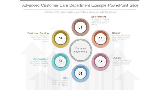 This is a advanced customer care department example powerpoint slide. This is a six stage process. The stages in this process are environment, choice, quality, cost, accessibility, customer service.