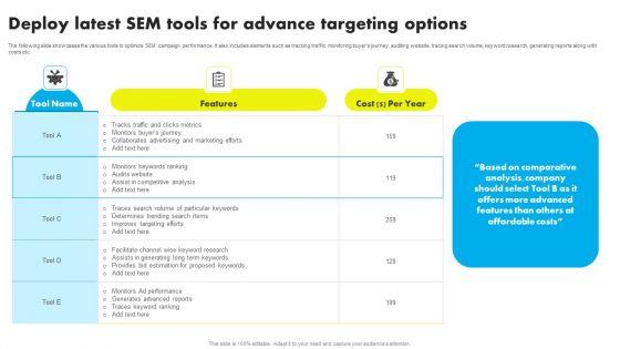 The following slide showcases the various tools to optimize SEM campaign performance. It also includes elements such as tracking traffic, monitoring buyers journey, auditing website, tracing search volume, keyword research, generating reports along with costs etc. Formulating a presentation can take up a lot of effort and time, so the content and message should always be the primary focus. The visuals of the PowerPoint can enhance the presenters message, so our Deploy Latest SEM Tools For Advance Targeting Options Ppt Icon Examples PDF was created to help save time. Instead of worrying about the design, the presenter can concentrate on the message while our designers work on creating the ideal templates for whatever situation is needed. Slidegeeks has experts for everything from amazing designs to valuable content, we have put everything into Deploy Latest SEM Tools For Advance Targeting Options Ppt Icon Examples PDF.