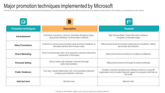 This slide shows various products or service promotion techniques deployed by Microsoft to generated huge profits. It also techniques such as advertisement, sales promotion, direct marketing, personal selling and public relations. Explore a selection of the finest Major Promotion Techniques Implemented By Strategic Advancements By Microsofts Clipart Pdf here. With a plethora of professionally designed and pre-made slide templates, you can quickly and easily find the right one for your upcoming presentation. You can use our Major Promotion Techniques Implemented By Strategic Advancements By Microsofts Clipart Pdf to effectively convey your message to a wider audience. Slidegeeks has done a lot of research before preparing these presentation templates. The content can be personalized and the slides are highly editable. Grab templates today from Slidegeeks. This slide shows various products or service promotion techniques deployed by Microsoft to generated huge profits. It also techniques such as advertisement, sales promotion, direct marketing, personal selling and public relations.