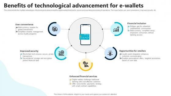 This slide exhibits the multiple advantages of technological advancement for digital wallets that lead to secure and seamless processing of operations. The major factors are user convenience, improved security, etc. Want to ace your presentation in front of a live audience Our Benefits Of Technological Advancement For E Wallets In Depth Guide To Digital Wallets Fin SS V can help you do that by engaging all the users towards you. Slidegeeks experts have put their efforts and expertise into creating these impeccable powerpoint presentations so that you can communicate your ideas clearly. Moreover, all the templates are customizable, and easy-to-edit and downloadable. Use these for both personal and commercial use. This slide exhibits the multiple advantages of technological advancement for digital wallets that lead to secure and seamless processing of operations. The major factors are user convenience, improved security, etc.