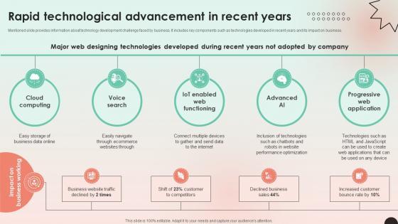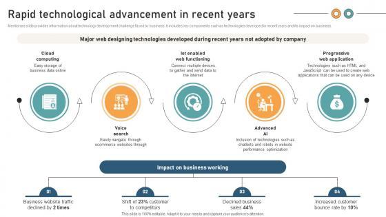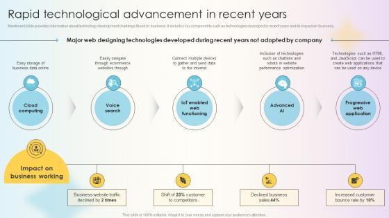 Mentioned slide provides information about technology development challenge faced by business. It includes key components such as technologies developed in recent years and its impact on business. Do you have an important presentation coming up Are you looking for something that will make your presentation stand out from the rest Look no further than Comprehensive Guide For Website Rapid Technological Advancement In Recent Years. With our professional designs, you can trust that your presentation will pop and make delivering it a smooth process. And with Slidegeeks, you can trust that your presentation will be unique and memorable. So why wait Grab Comprehensive Guide For Website Rapid Technological Advancement In Recent Years today and make your presentation stand out from the rest Mentioned slide provides information about technology development challenge faced by business. It includes key components such as technologies developed in recent years and its impact on business.