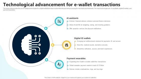 The below slide provides the use of multiple technologies for a digital wallet that helps to streamline the payment processing for merchants and individuals. The major technologies are AI assistants, digital ID wallets, and payment wearables. Explore a selection of the finest Technological Advancement For E Wallet Transactions In Depth Guide To Digital Wallets Fin SS V here. With a plethora of professionally designed and pre-made slide templates, you can quickly and easily find the right one for your upcoming presentation. You can use our Technological Advancement For E Wallet Transactions In Depth Guide To Digital Wallets Fin SS V to effectively convey your message to a wider audience. Slidegeeks has done a lot of research before preparing these presentation templates. The content can be personalized and the slides are highly editable. Grab templates today from Slidegeeks. The below slide provides the use of multiple technologies for a digital wallet that helps to streamline the payment processing for merchants and individuals. The major technologies are AI assistants, digital ID wallets, and payment wearables.