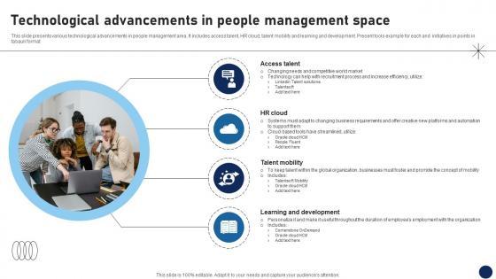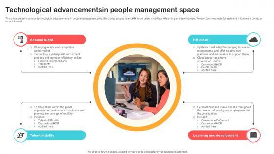 This slide presents various technological advancements in people management area. It includes access talent, HR cloud, talent mobility and learning and development. Present tools example for each and initiatives in points in tabaulr formatThis Technological Advancements In People Management Space DT SS V from Slidegeeks makes it easy to present information on your topic with precision. It provides customization options, so you can make changes to the colors, design, graphics, or any other component to create a unique layout. It is also available for immediate download, so you can begin using it right away. Slidegeeks has done good research to ensure that you have everything you need to make your presentation stand out. Make a name out there for a brilliant performance. This slide presents various technological advancements in people management area. It includes access talent, HR cloud, talent mobility and learning and development. Present tools example for each and initiatives in points in tabaulr format