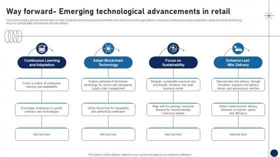 This slide provide a glimpse into the future of retail, leading to technological advancements and evolving consumer expectations. It includes continuous learning and adaptation, adopt blockchain technology, focus on sustainability and enhance last mile delivery. Explore a selection of the finest Way Forward Emerging Technological Advancements In Retail Way Forward Ppt Sample here. With a plethora of professionally designed and pre-made slide templates, you can quickly and easily find the right one for your upcoming presentation. You can use our Way Forward Emerging Technological Advancements In Retail Way Forward Ppt Sample to effectively convey your message to a wider audience. Slidegeeks has done a lot of research before preparing these presentation templates. The content can be personalized and the slides are highly editable. Grab templates today from Slidegeeks. This slide provide a glimpse into the future of retail, leading to technological advancements and evolving consumer expectations. It includes continuous learning and adaptation, adopt blockchain technology, focus on sustainability and enhance last mile delivery.