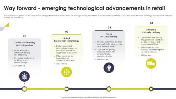 This slide provide a glimpse into the future of retail, leading to technological advancements and evolving consumer expectations. It includes continuous learning and adaptation, adopt blockchain technology,focus on sustainability and enhance last mile delivery. Slidegeeks is here to make your presentations a breeze with Way Forward Emerging Technological Advancements In Retail DT SS V With our easy-to-use and customizable templates, you can focus on delivering your ideas rather than worrying about formatting. With a variety of designs to choose from, you are sure to find one that suits your needs. And with animations and unique photos, illustrations, and fonts, you can make your presentation pop. So whether you are giving a sales pitch or presenting to the board, make sure to check out Slidegeeks first This slide provide a glimpse into the future of retail, leading to technological advancements and evolving consumer expectations. It includes continuous learning and adaptation, adopt blockchain technology,focus on sustainability and enhance last mile delivery.