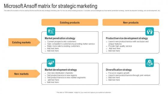 This slide shows matrix which is used by the Microsoft to develop strategic marketing plan for new as well as existing products . It includes various strategies such as market penetration strategy, market development strategy, service development, etc. Retrieve professionally designed Microsoft Ansoff Matrix For Strategic Marketing Strategic Advancements By Microsofts Guidelines Pdf to effectively convey your message and captivate your listeners. Save time by selecting pre-made slideshows that are appropriate for various topics, from business to educational purposes. These themes come in many different styles, from creative to corporate, and all of them are easily adjustable and can be edited quickly. Access them as PowerPoint templates or as Google Slides themes. You do not have to go on a hunt for the perfect presentation because Slidegeeks got you covered from everywhere. This slide shows matrix which is used by the Microsoft to develop strategic marketing plan for new as well as existing products . It includes various strategies such as market penetration strategy, market development strategy, service development, etc.